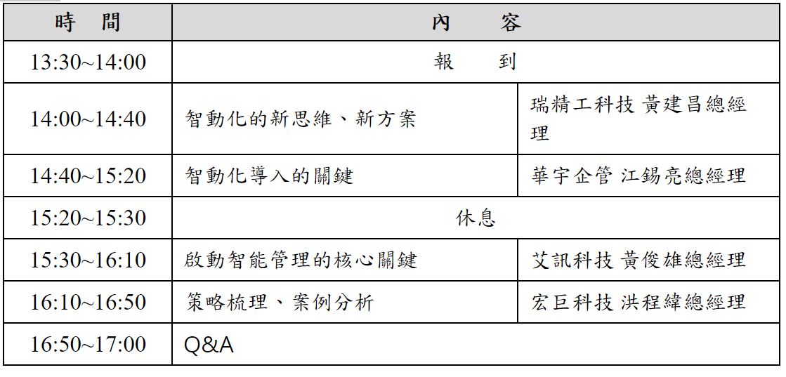 隨著科技技術的演進,新舊工廠同樣面臨相同的問題,製造業者想以自動化新技術,解決缺工、管理效率、生產效益等問題時,往往因為問題複雜且不知如何判斷、從何做起,甚至不知道如何問起。本次研討會透過邀請管理顧問、數據可視化、自動化、產業專家,讓智慧製造從開始到實現,可以有價值、有步驟、有方法,而不會不知所措。
