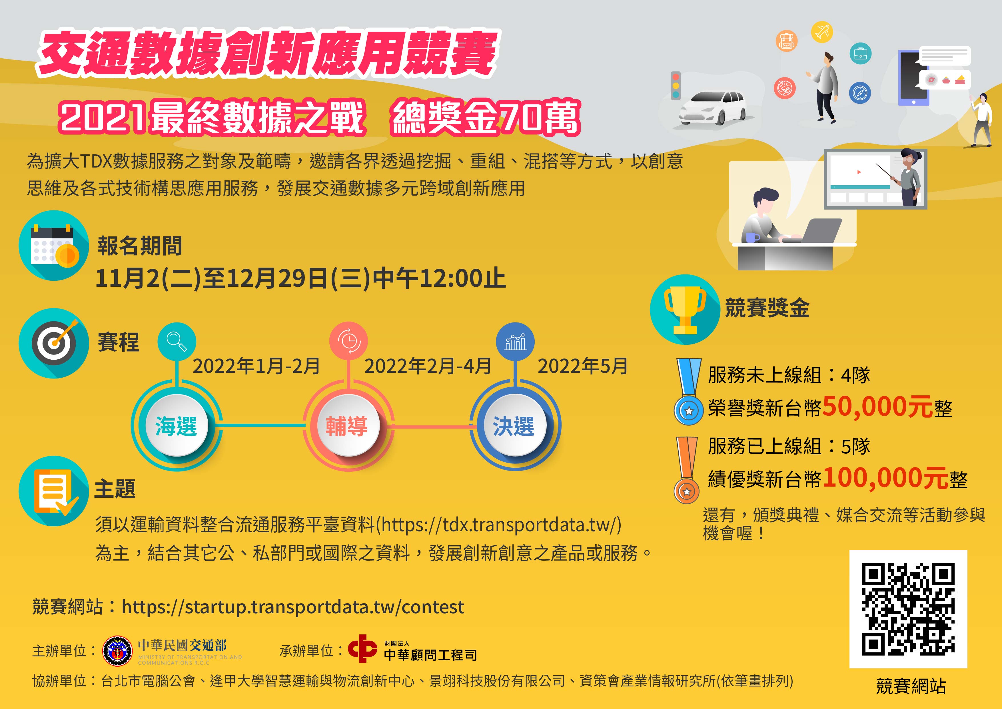 【轉載】交通數據創新應用競賽於110年11月2日至12月29日受理報名,總獎金高達70萬,歡迎踴躍參加~