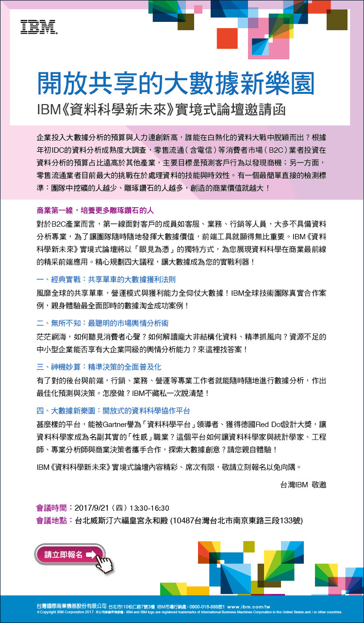 9/21(四)『開放共享的大數據新樂園』 IBM《資料科學新未來》實境式論壇