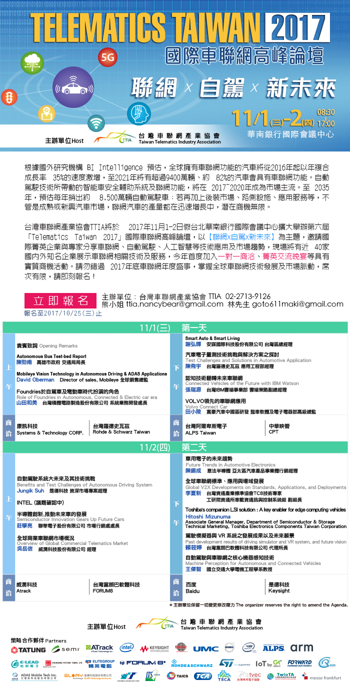 台灣車聯網產業協會TTIA將於2017年11月1-2日假台北華南銀行國際會議中心擴大舉辦第六屆「Telematics Taiwan 2017」國際車聯網高峰論壇,以【聯網x自駕x新未來】為主題,邀請國際菁英企業與專家分享車聯網、自動駕駛、人工智慧等技術應用及市場趨勢。